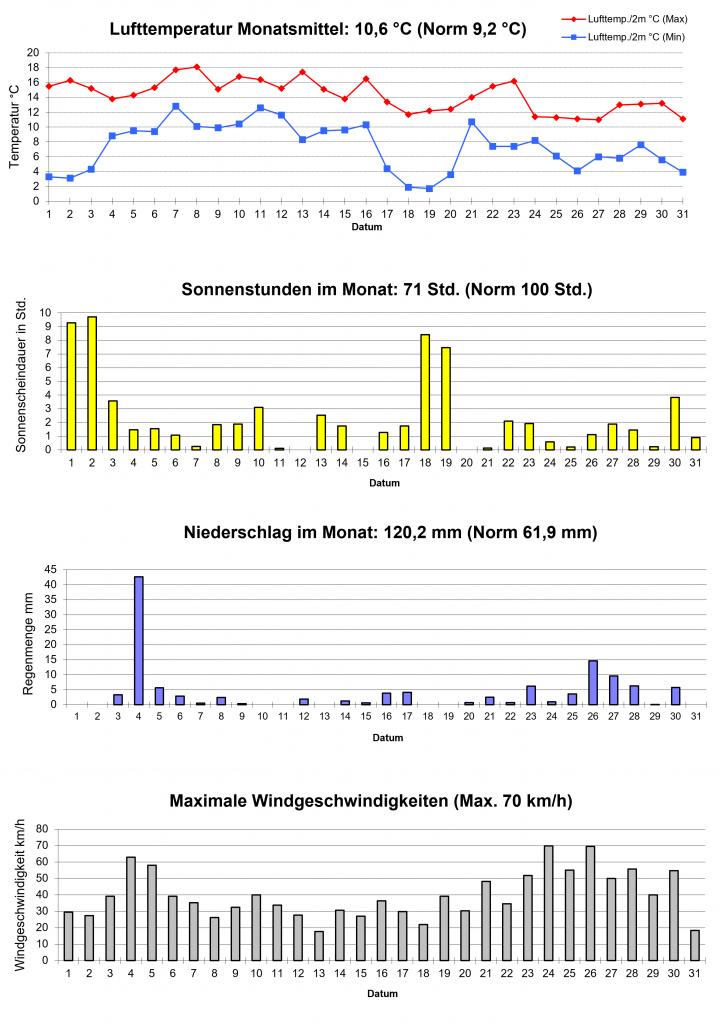 Die Niederschläge blieben mit 54,7 mm leicht unterdurchschnittlich. Der nasseste und auch windigste Tag war der 13. September. Die Monatsmitte wurde von Sturmtief „Zack“ zwar auch bei uns ordentlich durchgepustet – besonders schwere Sturmböen blieben aber aus.