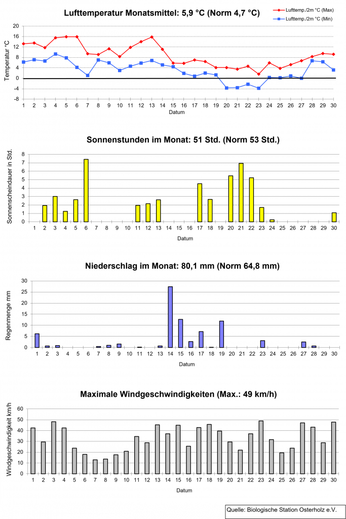 Im Monatsmittel lagen die Temperaturen 1,2 °C über dem langjährigen Mittel der Referenzperiode (1961-1990). Die Sonnenstunden entsprachen nahezu dem Durchschnitt, während die Niederschläge knapp 25 % über dem langjährigen Mittel lagen. Dieser hohe Wert ist insbesondere dem außerordentlich regnerischen 14. November zu verdanken, als ein Drittel der Monatsniederschläge fielen. Bundesweit zählte Osterholz im November 2025 zu den niederschlagsreichsten Messstandorten.