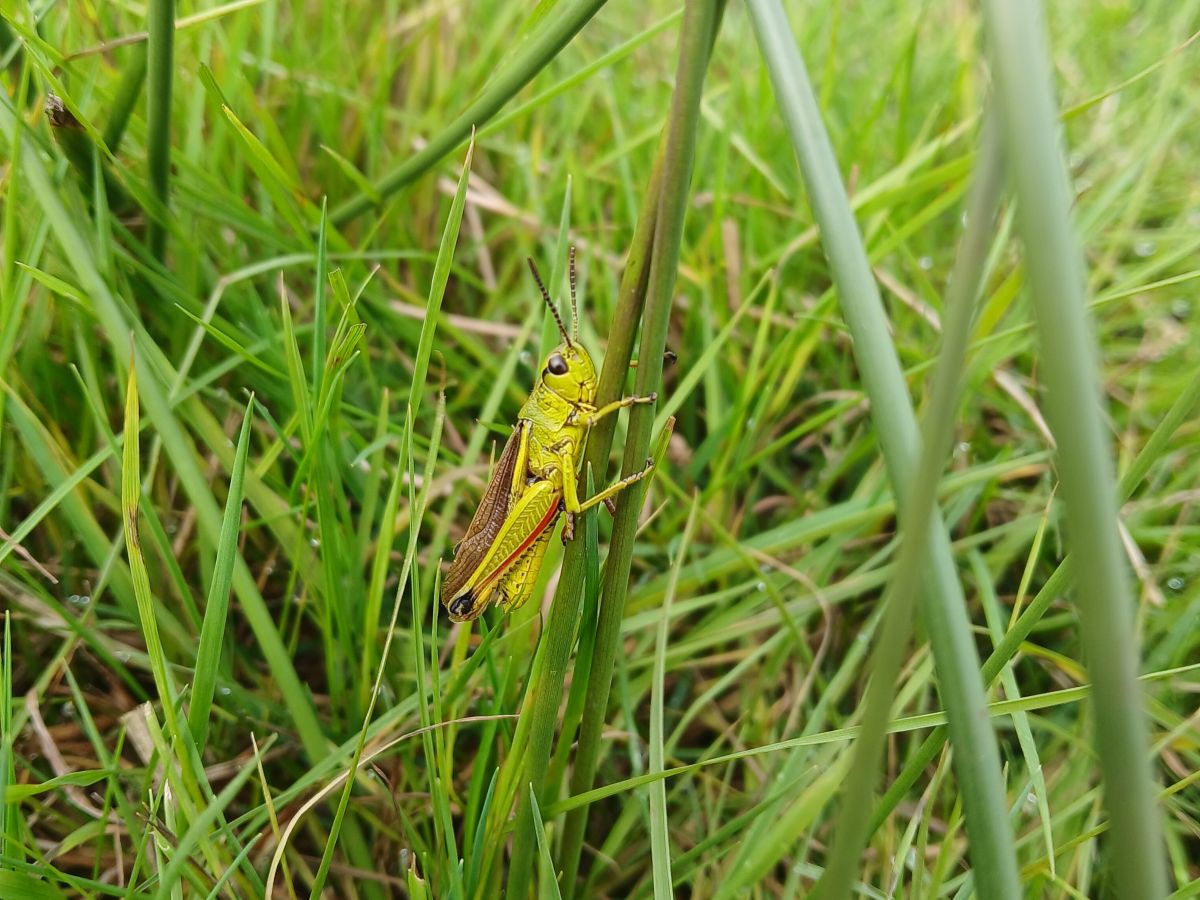 Während unserer Pflegearbeiten in der Hammeniederung beobachten wir sie immer häufiger: Die Sumpfschrecke (Stethophyma grossum). Vor einigen Jahren wurde sie für Niedersachsen und Bremen noch als ‚gefährdet‘ eingestuft. Dank der extensiven Nutzung von Feucht- und Nasswiesen erholen sich die Bestände. Außerdem profitiert die Sumpfschrecke von der „Mediterranisierung“ des Klimas. Aktuell gilt die Art als ungefährdet in Niedersachsen und Bremen (NLWKN: INN/2-2025, RL).