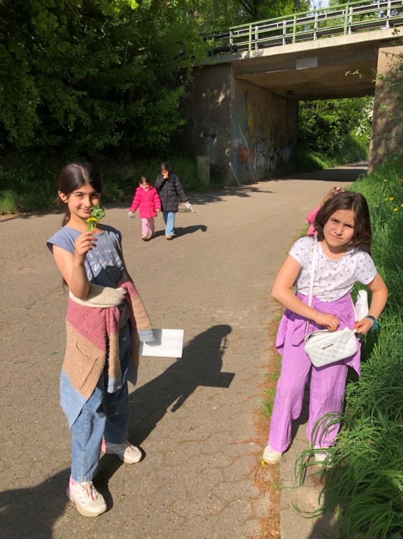 Welche Pflanzen und Kräuter wachsen vor unserer Haustür? Mit Bestimmungsbüchern machen wir einen Rundgang in die Umgebung.