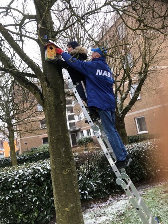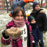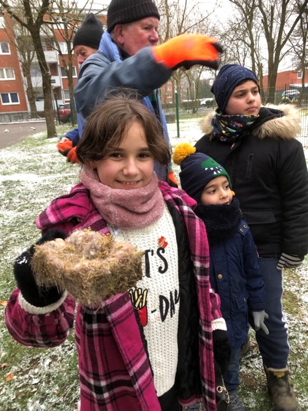 Eine der ersten Aktionen der Rainbow Kids mit Imme war die Erstellung von Futterglocken für die Vögel. Dafür wurde Fett geschmolzen und Körner eingerührt. Die Glocken werden im Drosselstraßen-Viertel aufgehangen.