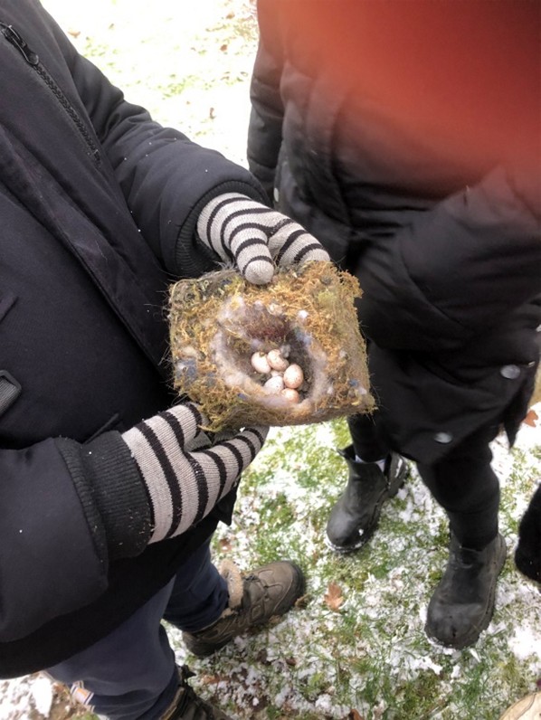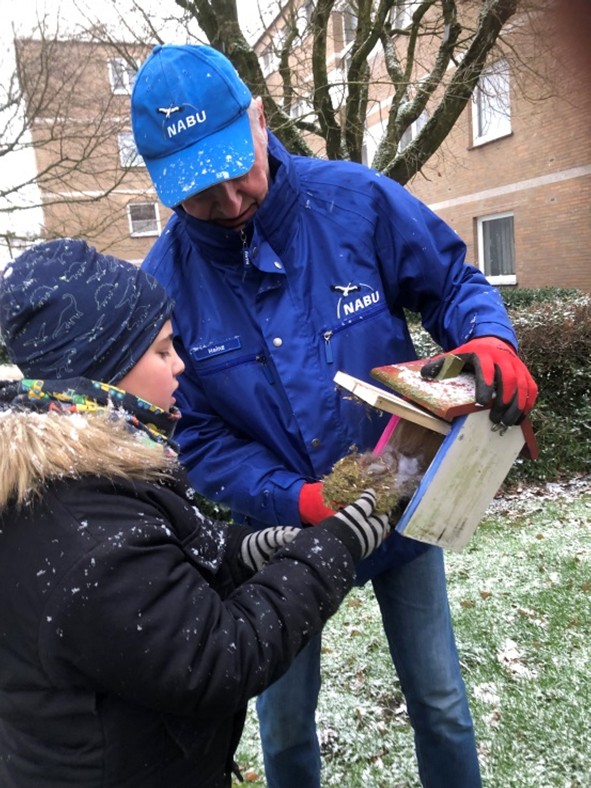 Mit tatkräftiger Hilfe der Experten vom NABU Osterholz-Scharmbeck wurden die Nistkästen vom Vorjahr kontrolliert und gesäubert. Neben kunstvoll geflochtenen Nestern fanden die Kids sogar Eier, die im letzten Jahr nicht mehr ausgebrütet wurden. Sie staunten nicht schlecht, dass eine so kleine Blaumeise 8 – 10 Eier legen kann.
