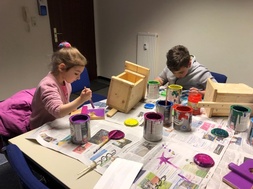 Über den NABU konnten wir weitere Nistkästen beziehen, die die Kids voller Begeisterung bunt und individuell anmalten. Sie werden im Herbst gemeinsam aufgehängt.