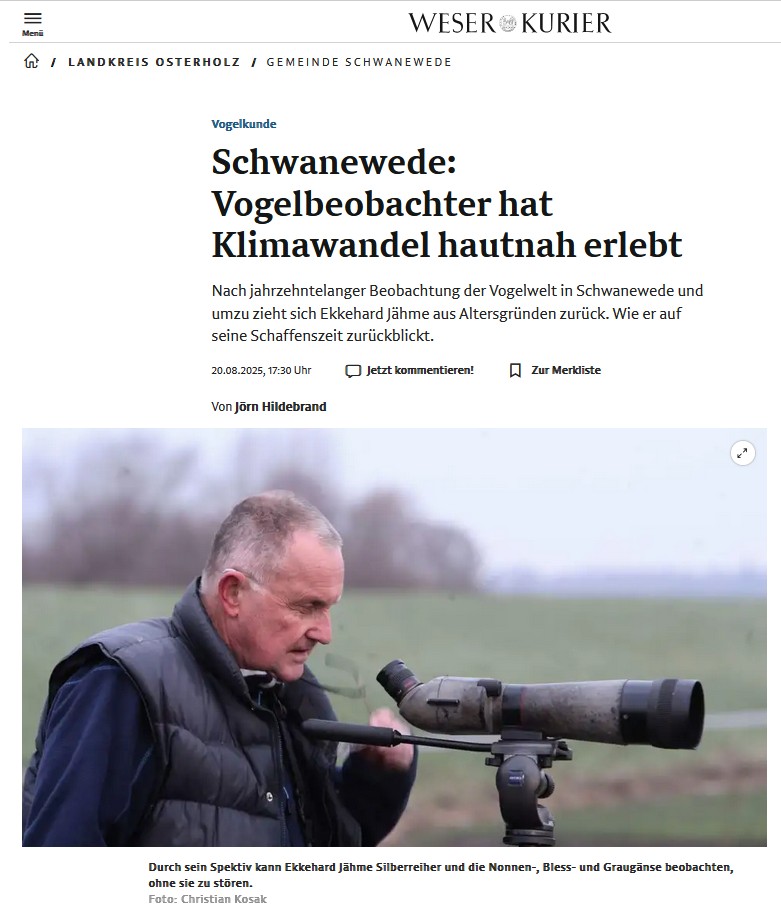 Ekkehard Jähme war langjähriges Vorstandsmitglied der BioS und hat so einige Vogelzählungen für und mit der BioS gemacht. Nun ist im Weser Kurier und in Die Norddeutsche ein Bericht über ihn erschienen. Unter „Schwanewede: Vogelbeobachter hat Klimawandel hautnah erlebt“ (WK) wird seine Leidenschaft für die Vögel und Laufbahn als Vogelzähler von Jörn Hildebrand nachgezeichnet.